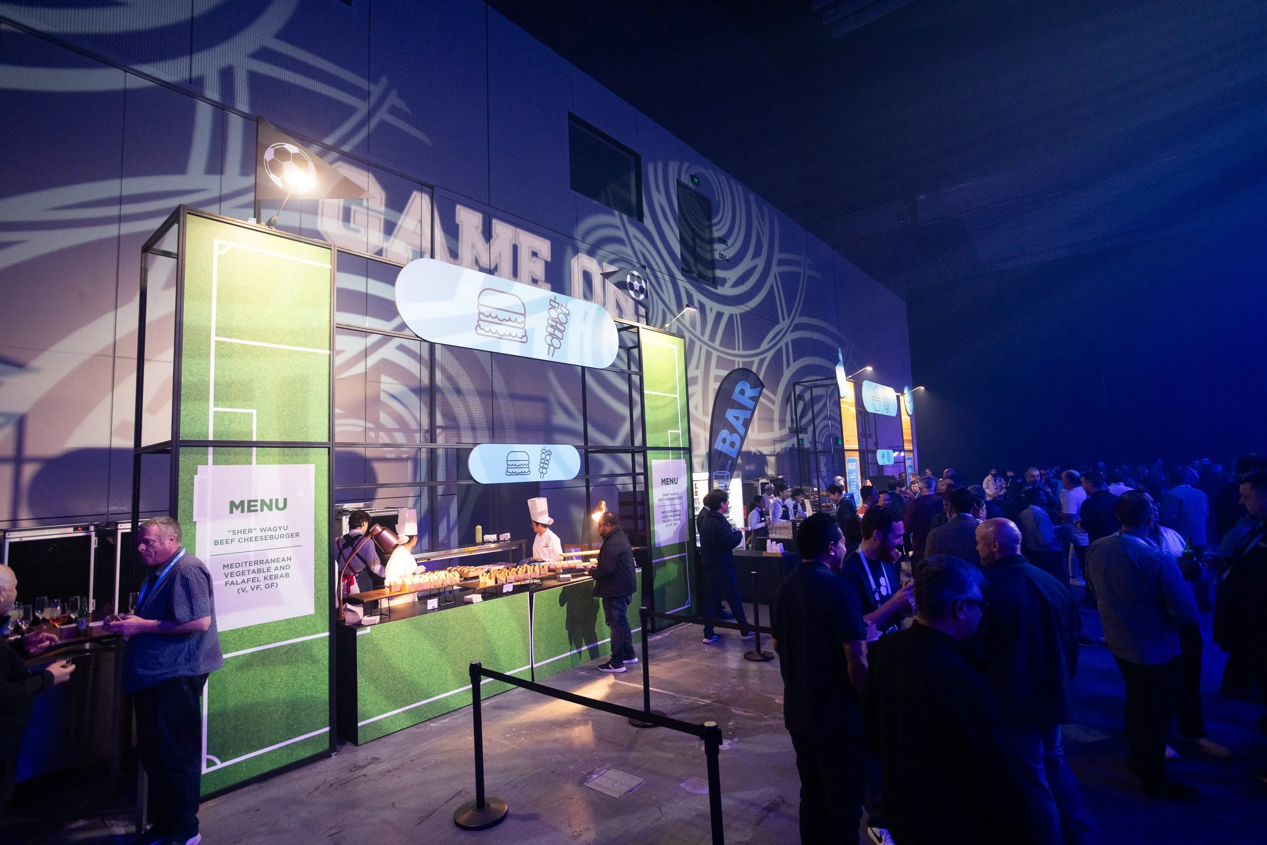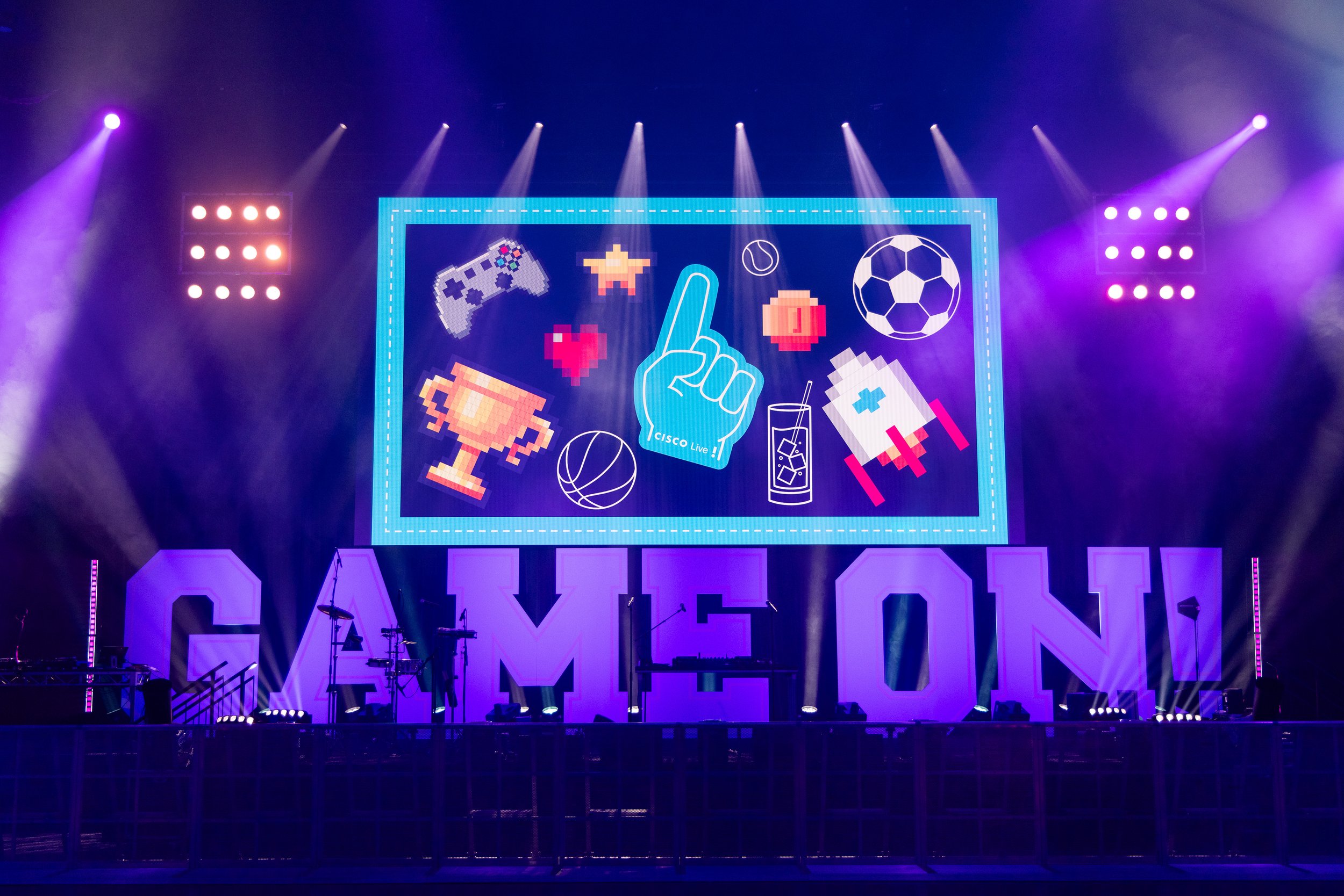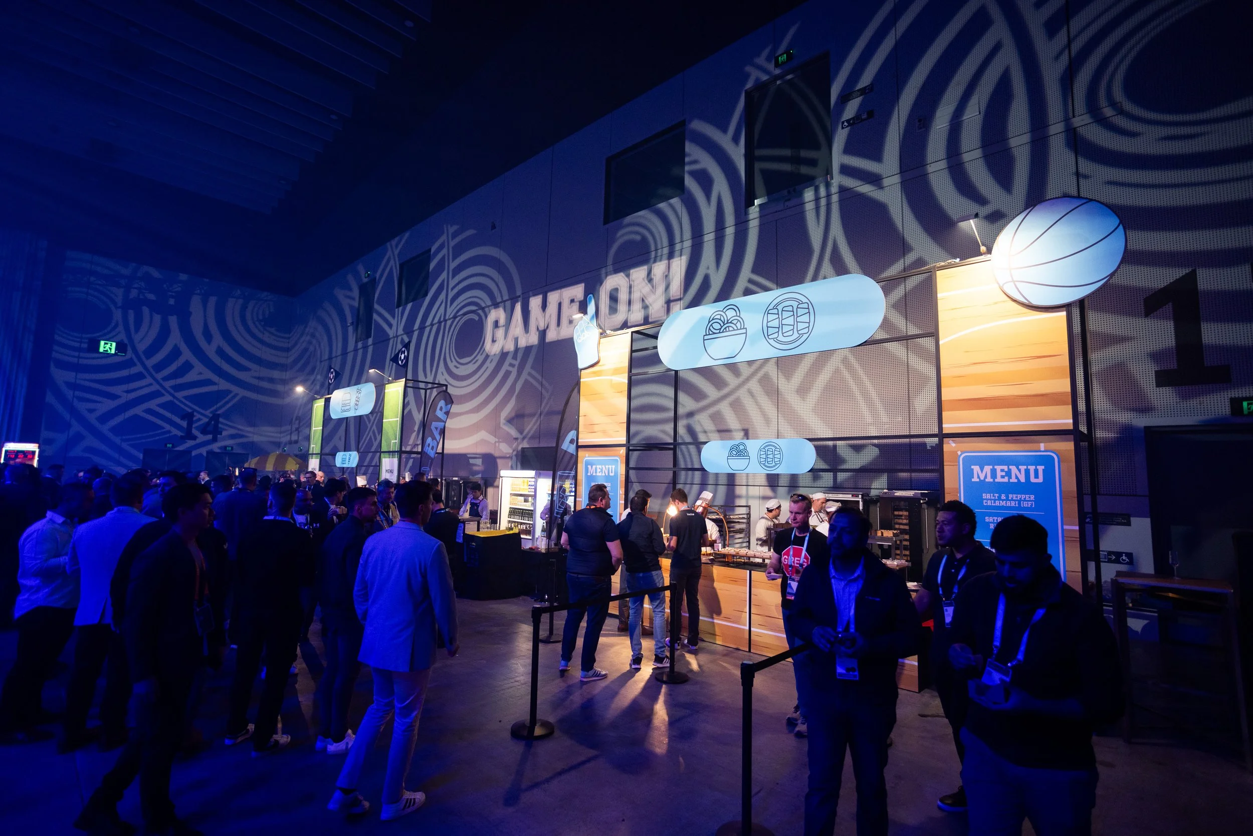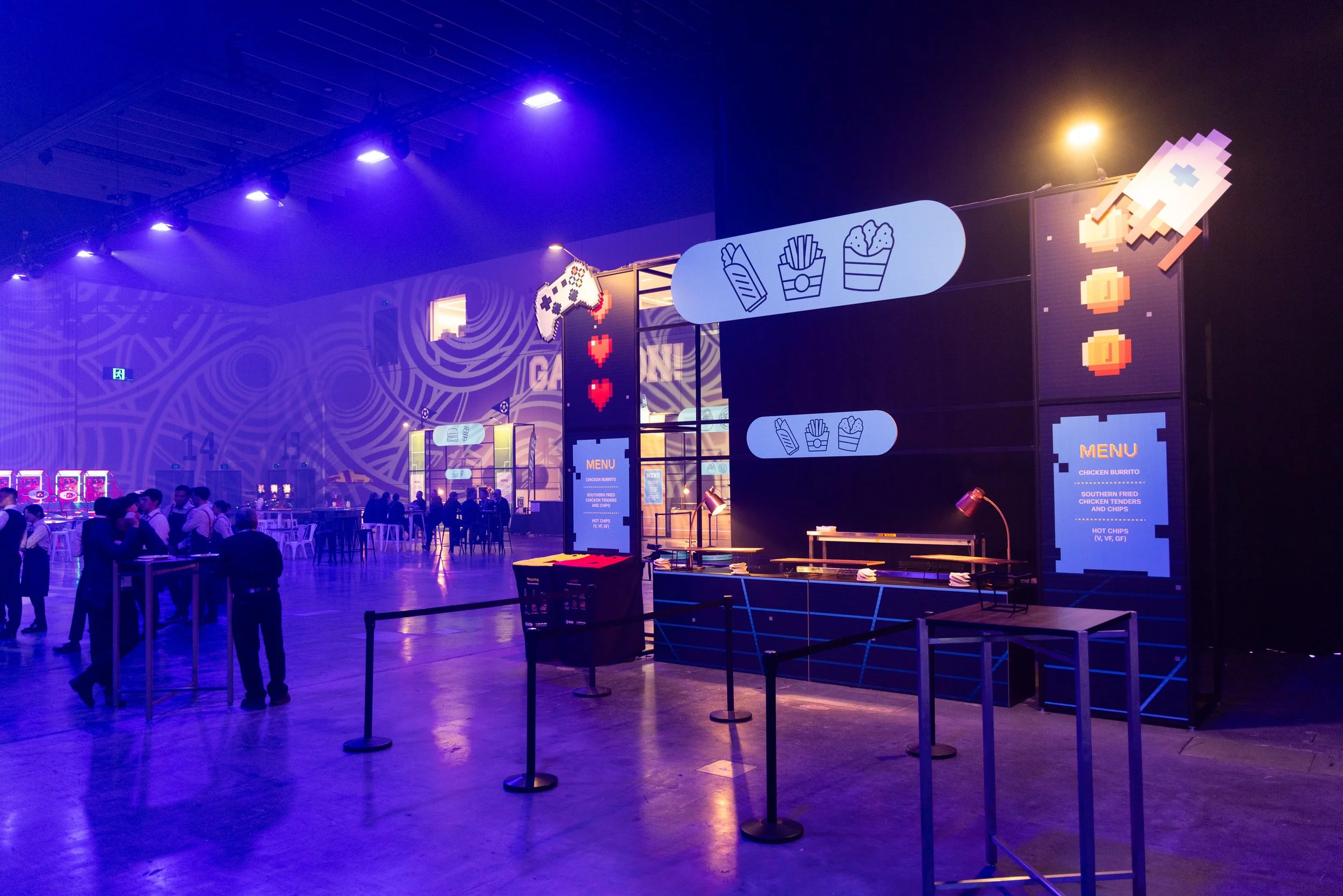The Cisco Live! Celebration in Melbourne was a high-energy evening event combining live music, interactive zones, and immersive experiences. The theme, ‘GAME ON!’, blended sporting and gaming elements, inspiring the visual identity I designed and rolled out across signage, digital screens, environmental graphics, and printed collateral. The food stations were crafted to add playful, fun moments that brought the theme to life.